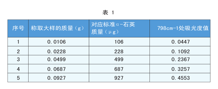 准确称取大样(标准α-石英与溴化钾的混合样,标准α-石英含量为10μg/mg)10.0mg、20.0mg、50.0mg、70.0mg、90.0mg(见表1、图一),分别加入溴化钾粉末240.0mg、230.0mg、.....、160.0mg。之后分别于玛瑙研钵中混匀并全部转移至压片模具中,在压片机下压片。以空气为背景扫描制得的锭片,记录其900~600cm -1 的红外谱图。